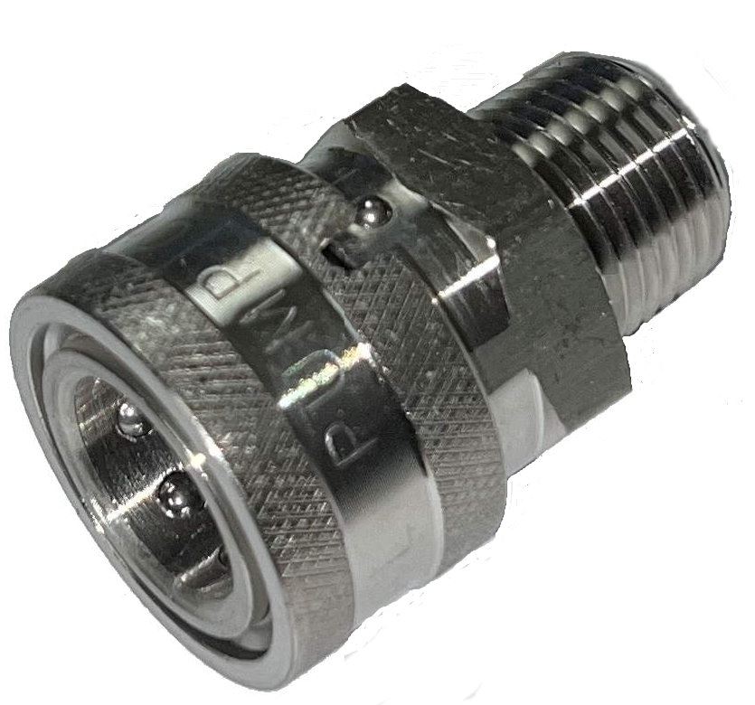Specifications: • Quick Disconnect Coupler: Socket• Body Material: 304 Stainless steel• Socket Size: 1/2"• Thread: 1/2” NPT-M• Max Temp: 175°• Max Operating Pressure: 5,000 PSI• Weight: 0.30 lb