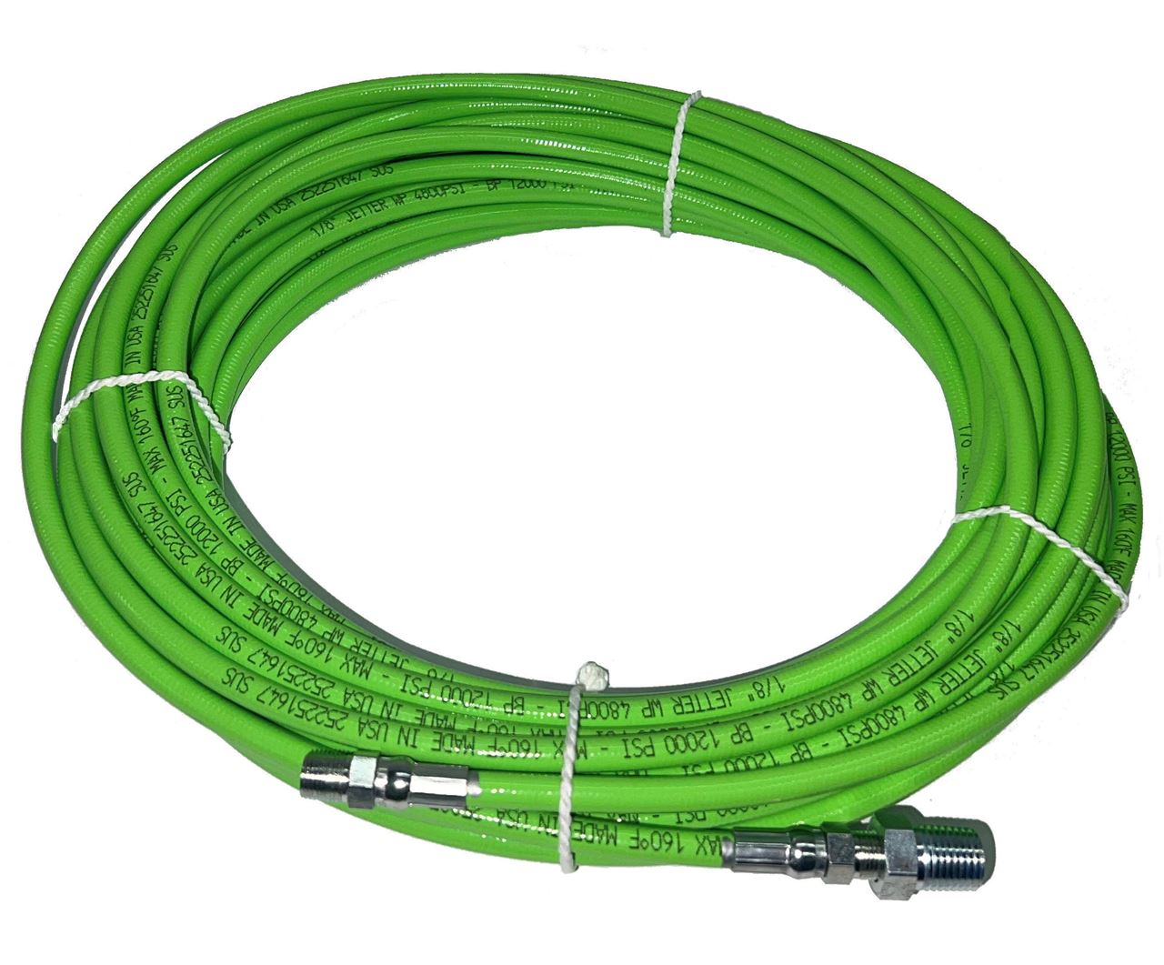 Propulse Green 1/8” X 50’ Lateral Line and Drain Cleaner Sewer Hose. Ideal for consumer and commercial sewer jetters with operating pressures of 4,800 PSI or less. Jetter Clean hoses offer optimum flexibility and lightweight construction. NOT FOR HOT WATER OR STEAM.