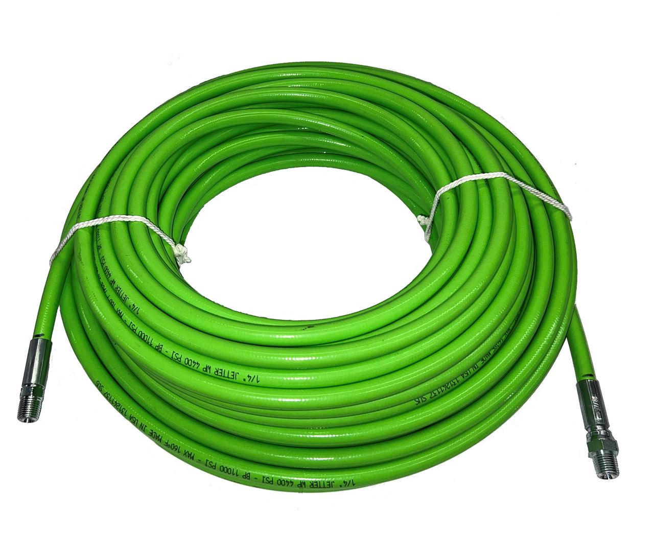 Propulse Green 1/4” X 100’ Lateral Line and Drain Cleaner Sewer Hose. Ideal for consumer and commercial sewer jetters with operating pressures of 4,400 PSI or less. Jetter Clean hoses offer optimum flexibility and lightweight construction. NOT FOR HOT WATER OR STEAM.